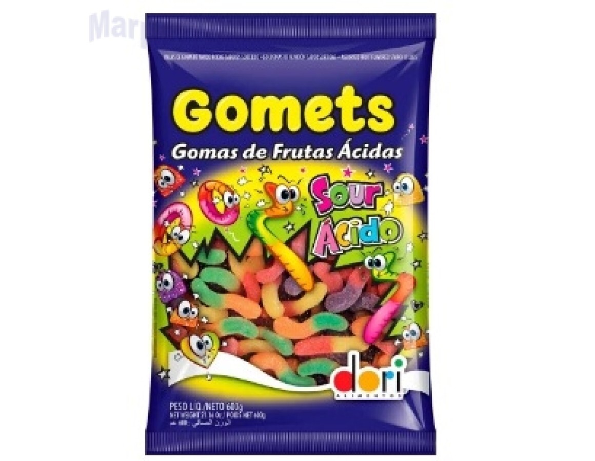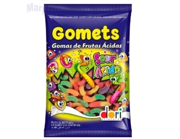 Balinhas de goma açucaradas ácidas em formato de minhocas e em cores sortidas, nos sabores laranja, limão, abacaxi, morango, uva e tutti frutti.