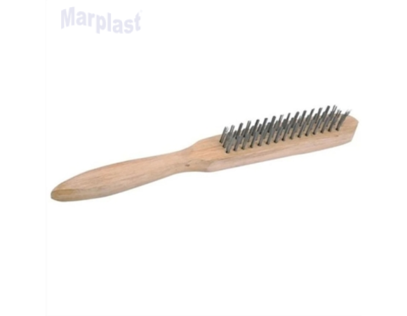 Escova de aço com cabo de madeira, submetidas a testes de aplicação prática para garantir sua resistência em uso intenso. Utilizada em trabalhos de limpeza de superfícies em geral.