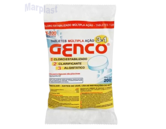 Produto concentrado, contém 85% de cloro ativo. Possui estabilizante que inibe a degradação do cloro pelos raios UV (raios solares). GENCO® TABLETES MÚLTIPLA AÇÃO "3 em 1" apresenta dissolução lenta para cloração contínua e automática. Sua fórmula múltipla ação é recomendada especialmente para quem quer praticidade aliada à qualidade. Poderoso desinfetante (cloro com estabilizante), clarificante, algicida e algistático. Indicado para piscinas residenciais.