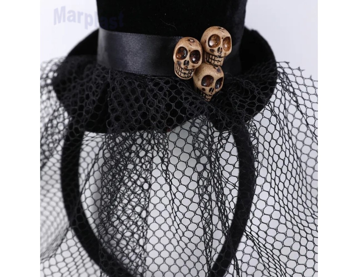 A Tiara Cartola Véu Halloween Preto Caveiras da Cromus é o acessório perfeito para transformar seu visual em festas de Halloween e fantasias, combinando estilo e mistério com seu design exclusivo de caveiras e véu.