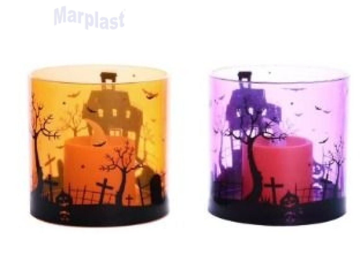 Ilumine sua decoração de Dia das Bruxas com este enfeite Porta-Vela Halloween. Possui estampas sombrias e coloridas de casas mal-assombradas, morcegos e abóboras, criando um clima perfeito para festas temáticas. O modelo amarelo e o modelo roxo trazem um toque vibrante e misterioso à sua decoração, sendo ideais para uso com velas LED.